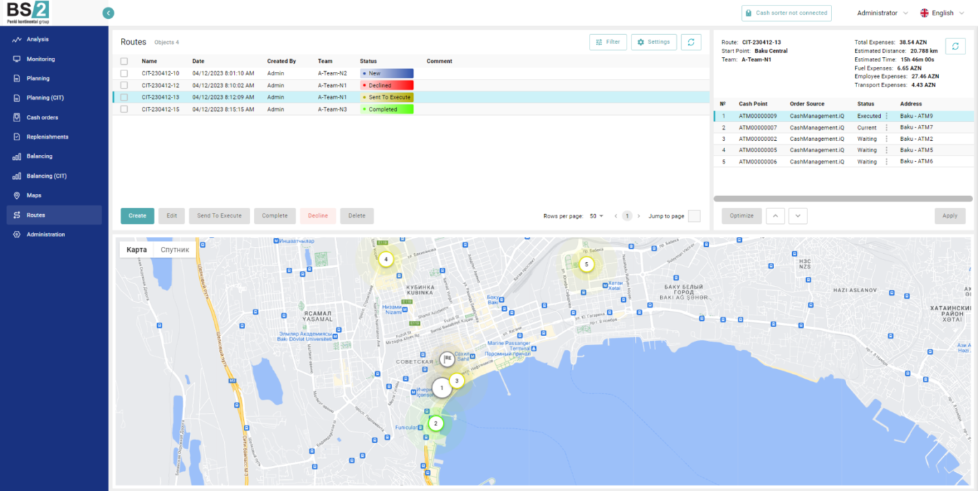 An important feature of the system is optimizing CIT schedules. Banks often face two scenarios: frequent collections with minimal cash reserves, leading to high maintenance costs, or fewer trips with larger cash reserves, resulting in idle funds.